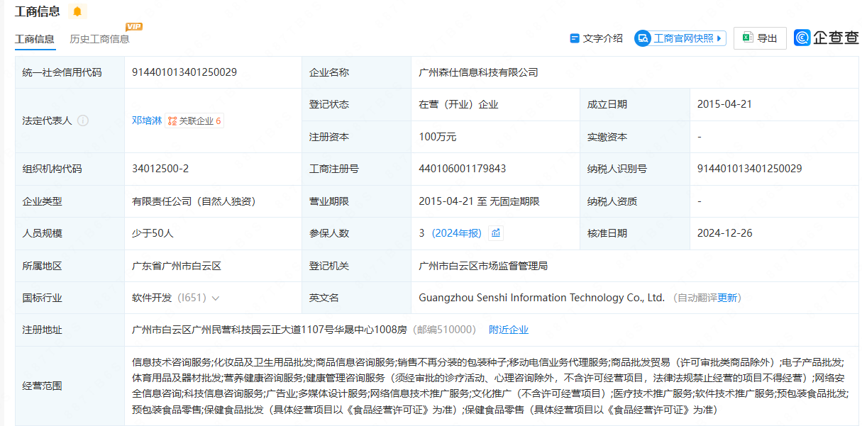 广州森仕信息科技有限公司成立于2015-04-21,法定代表人为邓培淋,电话:13424456252;企业注册地址位于广州市白云区广州民营科技园云正大道1107号华晟中心1008房,经营范围包含:信息技术咨询服务;化妆品及卫生用品批发;商品信息咨询服务;销售不再分装的包装种子;移动电信业务代理服务;商品批发贸易(许可审批类商品除外);电子产品批发;体育用品及器材批发;营养健康咨询服务;健康管理咨询服务(须经审批的诊疗活动、心理咨询除外,不含许可经营项目,法律法规禁止经营的项目不得经营);网络安全信息咨询;科技信息咨询服务;广告业;多媒体设计服务;网络信息技术推广服务;